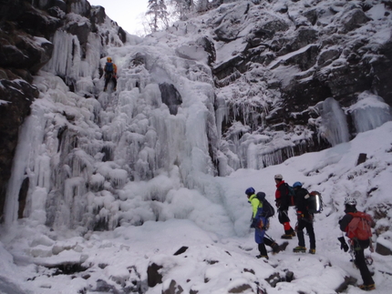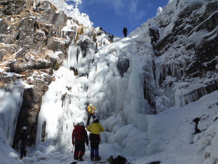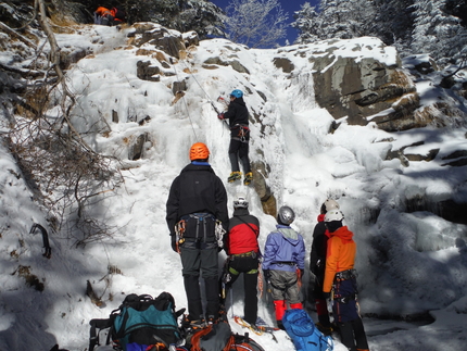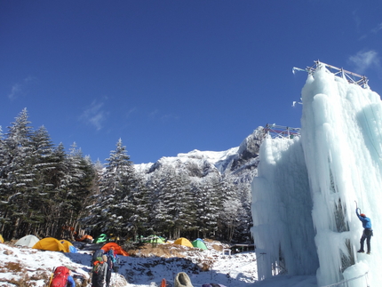 1日目の講習会ではジョウゴ沢F1でトップロープで登り、バイルの使い方やアイゼンの前爪の蹴り方など基本的動作を学び、講習生達は薄い氷に少しの不安を感じつつ、氷の感触を確かめていました。また、テント内での生活技術についても勉強してもらいました。2日目は2班に分かれて、ジョウゴ沢ルートと裏同心沢ルートをそれぞれ登攀。ジョウゴ沢ルートのF2核心部では氷の裏側に水が流れているのが見えるため、講習生はいつも以上に慎重に登っていました。今回は乙女の滝の右側を登り右ルンゼ3段50mのルートを登攀しました。稜線に出ると、間近に望む赤岳や大同心など、山頂から広がるパノラマは素晴らしいです。また山の魅力を存分に味わうことが出来た2日間でした。