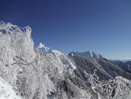 標高2350m付近では、本来の沢ルートから登れなかった為、右側の20mくらいの大滝を登り、そこからトラバースして懸垂下降で本沢へ降りました。そして第三ルンゼ最後の氷柱の滝は氷結が乏しい為、巻きましたが傾斜は立っていてベルグラに近い状態だったのでそれがこの日の核心部になってしまいました。P3の稜線に出るとまさかのラッセルで稜線を登りました。第三ルンゼから阿弥陀岳南稜に出ると風がありましたが間近に権現岳、先には富士山が良く見え、眺めは最高でした。南稜からの下山ルートも距離が長かった為、内容の濃い1日だったと思います。講習生達には、赤岳主稜登攀に向けて十分な練習になったのではないでしょうか。講習生の皆さん、大変お疲れ様でした。