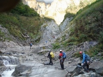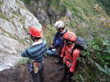 10月10日(月)この日の天気は曇りで、朝方は霧雨で朝6時頃まで登るか判断に迷いましたが、少し晴れ間も見えて来たので登ることになり登攀開始。南稜パーティーと中央稜パーティーに分かれて登攀します。前日の雨もあり、地面は濡れていて滑りやすい状況でした。この日は他にも谷川岳一ノ倉を登るクライマーが沢山いました。中央稜の取付きに8時半ごろ到着しました。ここで南稜パーティーと分かれます。取付きで待っているパーティーはいなかった為、すぐに登攀開始しました。雨で引き返したパーティーもいたため、先行パーティーは1パーティーだけ。岩も表面は乾いていましたが、中央稜の1ピッチ目から所々で滑った所がある為、少し慎重に登りました。3ピッチ目までは特に問題ありませんでした。4ピッチ目のチムニーは滑っている所があり、リードは少しいやらしい登攀になりました。4ピッチ目の終了点で殆どのパーティーが下山しました。この時、11時頃でしたが天気は何とか持ちそうなので、そのまま中央稜のを稜線を詰めます。時折、冷たい風が吹く為、防寒着が必要になります。稜線に登り詰めたのが13時20分ころです。頂上はガスがかかっていて、景色はあまり見えませんでしたが、今回は登れただけで満足してます。下山は18時半ころにロープェー駐車場に到着しました。南稜パーティーは悪天候の為、4ピッチ目の終了点で下山しました。オリソンテの講習会では今後、一ノ倉をいつかは登ろう思っている皆様を応援しますので、岩登りの講習会などの参加をお待ちしております。今回参加された講習生皆さん、大変お疲れ様でした。
