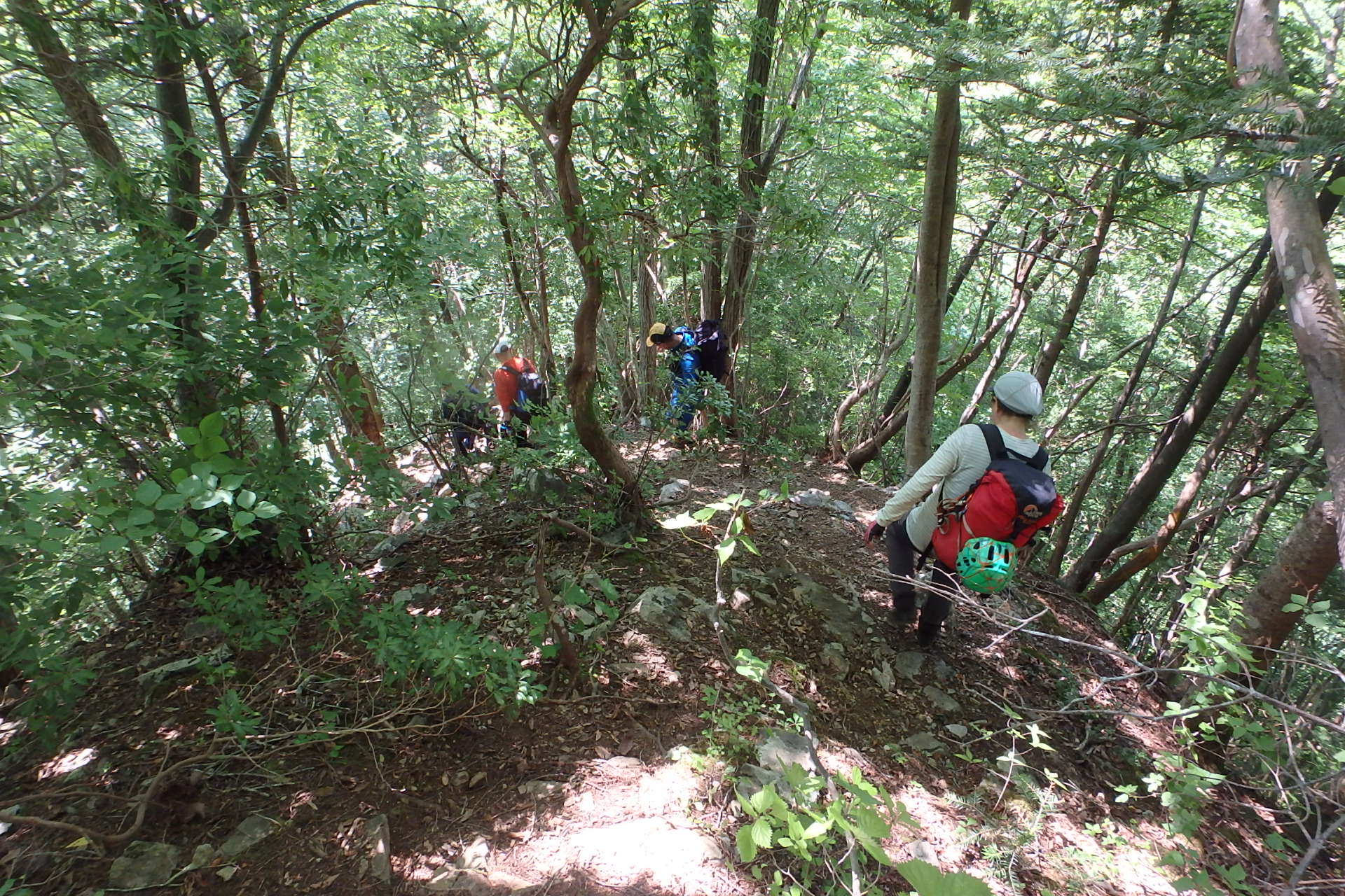 駐車したゲート前から30分ほど林道を歩いて入渓し、すぐに短いながらも苔とイワタバコが奇麗なゴルジュが迎えてくれました。その後も滝に岩が挟まったチョックストーンやチョックウッド滝、なめ滝や階段状の滝などが連続して飽きることなく最後の10m滝に到着しました。この滝と途中の2段15mの2つの滝は高巻きしましたが、他の滝は講習生の皆さんも問題なく突破して短い詰めの後に登山道に出ました。水量が少なかったこともあってか、前回の逆川に比べると滝の登攀も高巻きもかなり易しく感じました。その後、一部急で滑る道があり、講習生の中にはここが一番大変そうな方もいましたが、無事に下山しました。